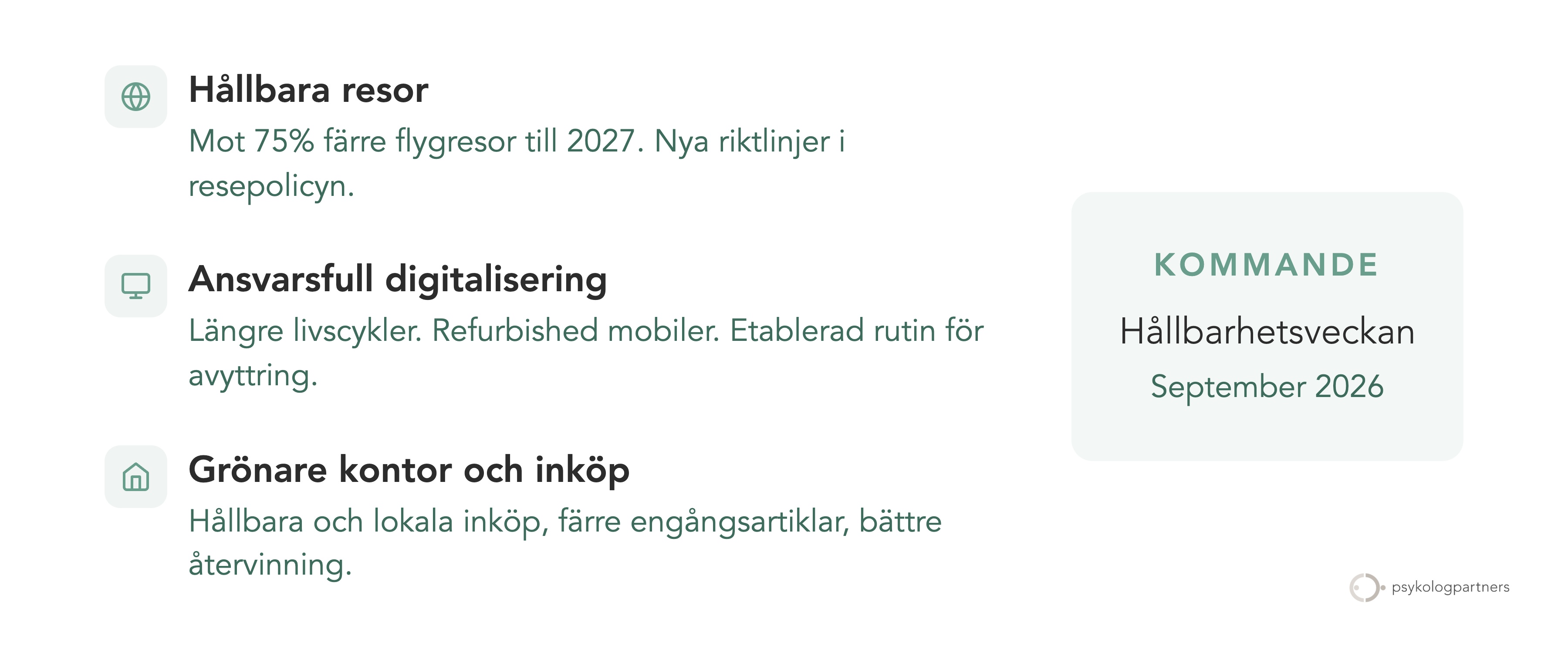 Under 2025 tog vi på Psykologpartners flera konkreta steg i vårt hållbarhetsarbete. Vi halverade antalet nationella flygresor, etablerade nya rutiner för hur vi köper och avyttrar teknik — och började ställa oss frågan “behövs det här, och varför?” oftare. Nu blickar vi framåt mot 2026 med fortsatt fokus på de förändringar som gör skillnad i vardagen.
