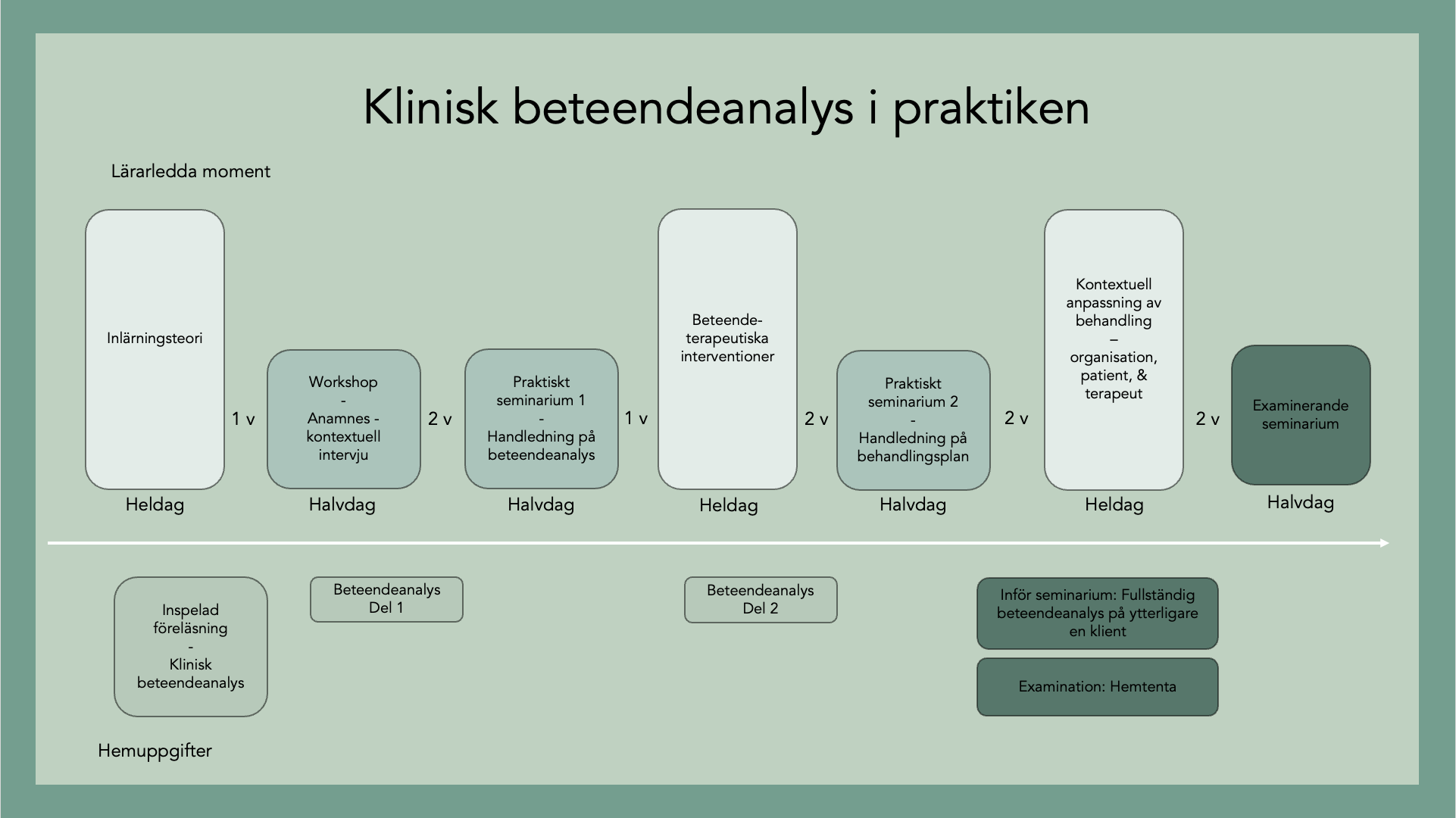 Kursen är en praktisk utbildning där du som deltagare får använda beteendeanalys på egna ärenden och fördjupa förståelsen för problematiska beteenden samt valet av riktade behandlingsinterventioner.